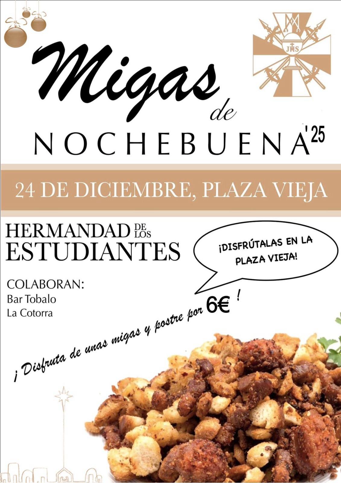 El próximo 24 de diciembre, desde primera hora, os esperamos en la Plaza Vieja para compartir un rato de convivencia, sabor y hermandad alrededor de unas buenas migas, preparadas con el cariño de siempre y pensadas para disfrutar en comunidad.